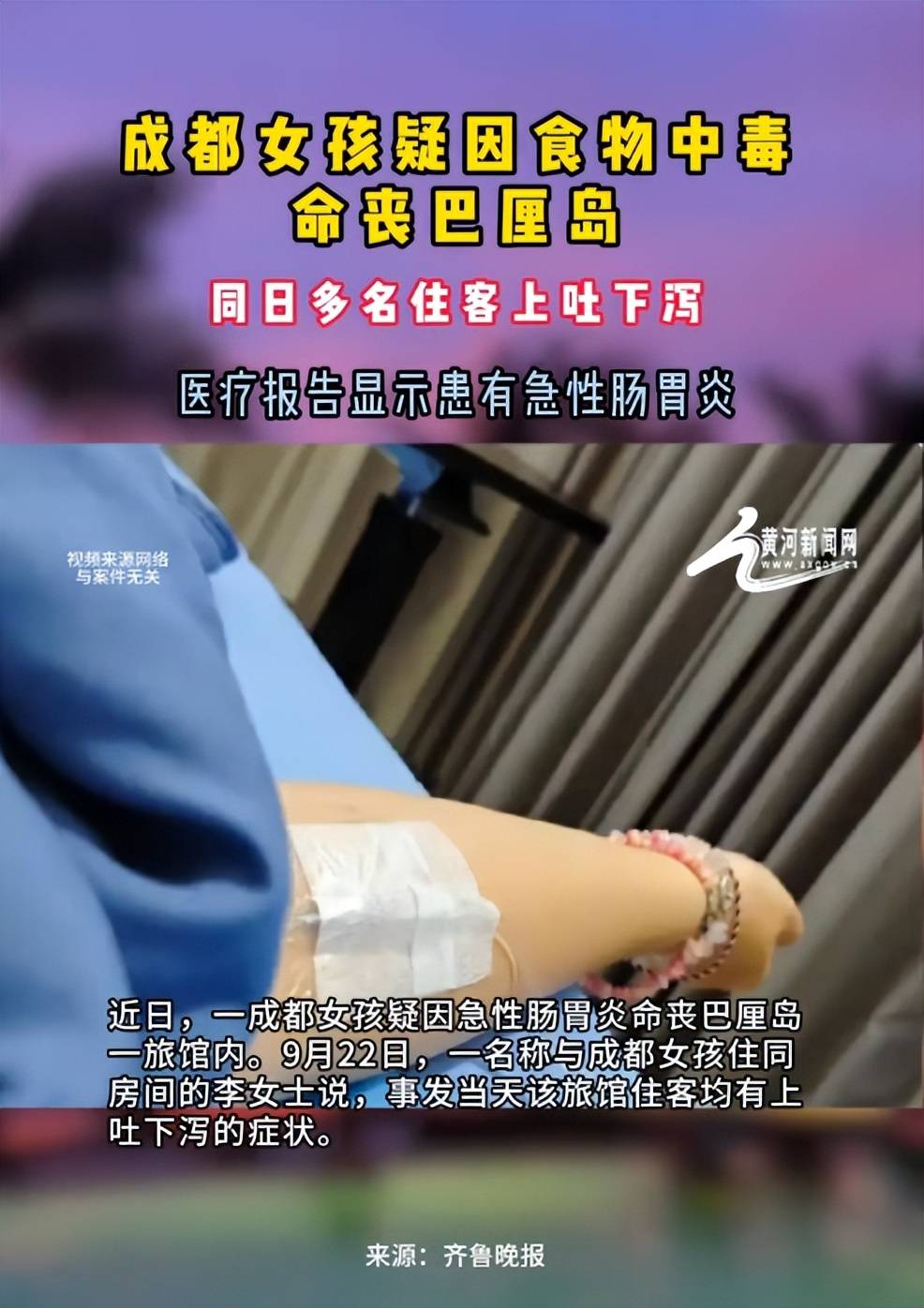 成都女孩已得到认识。急性肠胃炎激发的脱水若及时弥补电解质并送医,中国驻登巴萨总,救护车并非为她而来,李密斯回忆,其时她不只脱水严沉,她们供给的就诊记实、缴费凭证及客店现场照片,9月2日上午。